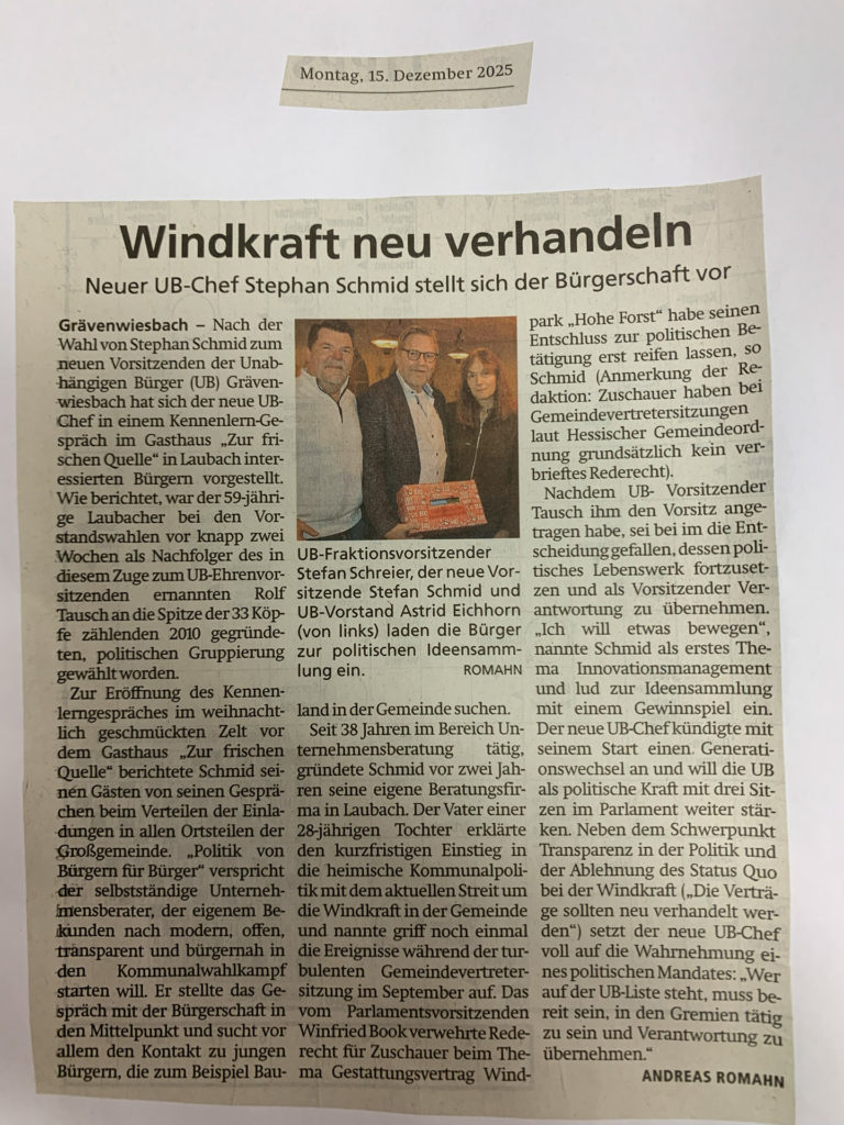 Der Bürgertreff der UB hat am 12.12.2025 „im Zelt“ des Restaurants zur Frischen Quelle in Laubach stattgefunden. Der neue UB Vorsitzende Stephan Schmid hat sich den Bürgern vorgestellt. Schmid erläuterte, wie und warum er den Weg in die Politik gefunden hat. Als Fokus-Themen hatte Schmid die „ideenlose Windkraftpolitik“ und die „fehlende Innnovationskraft“ der Gemeinde dabei. Die versprochene Innovationsinitiative der UB wurde unmittelbar gestartet. Auch die Presse war vor Ort….